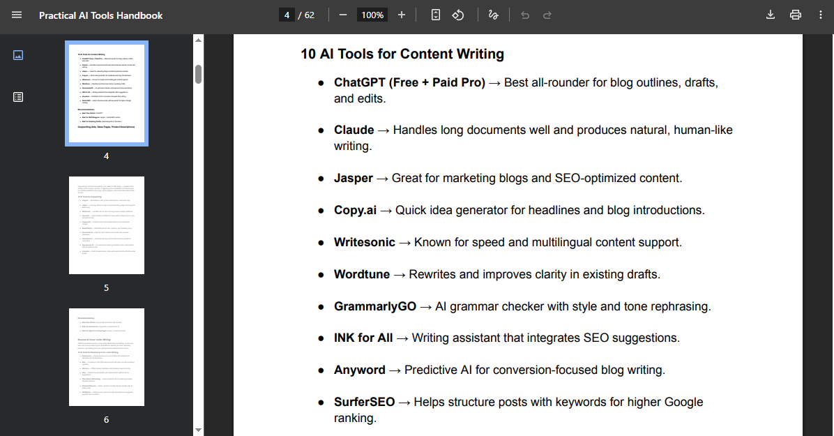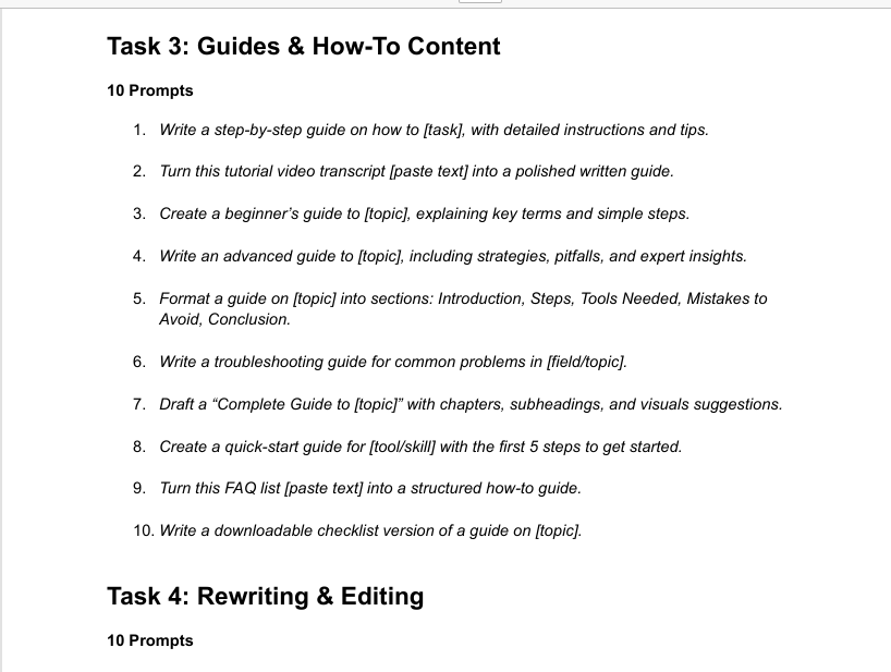 ✅ Prompt Handbook – 200+ ready-to-use prompts for chatbots and image generators. These aren’t generic “write me a blog” prompts. They’re tailored for specific tasks—like writing a blog outline, crafting an email sequence, creating visuals, optimizing resumes, or even sparking business ideas. Copy, paste, tweak, and you’re good to go.